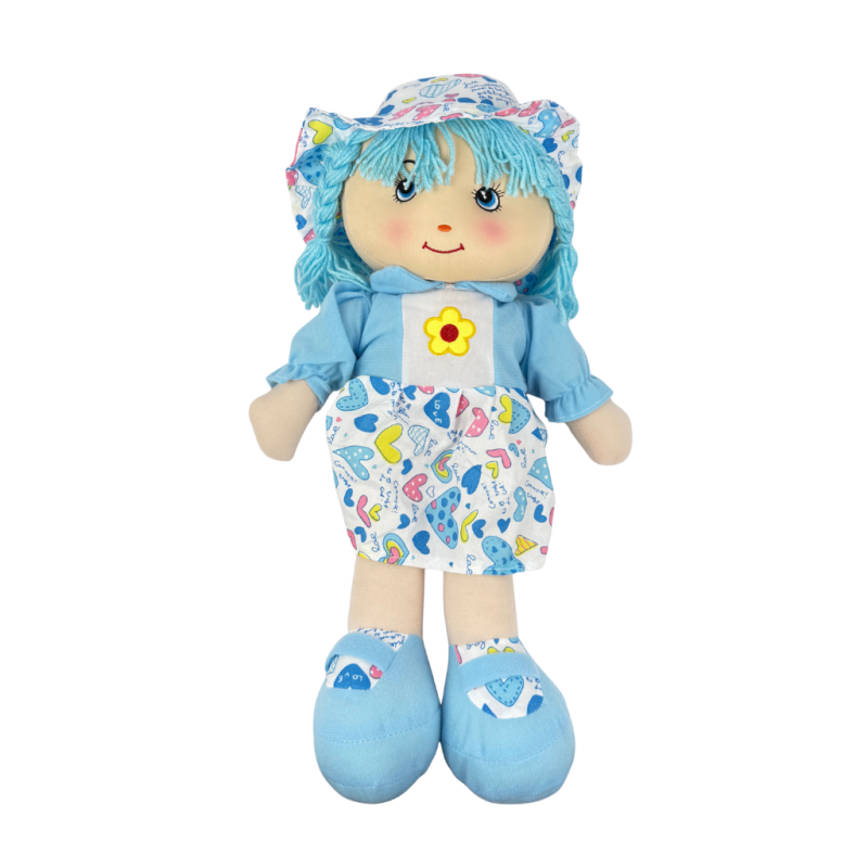 Нежна и мека кукла в синьо, с усмихнато личице, рокля с цветни сърца и удобни пантофки. Перфектна за гушкане, игра и подарък.