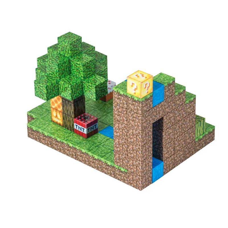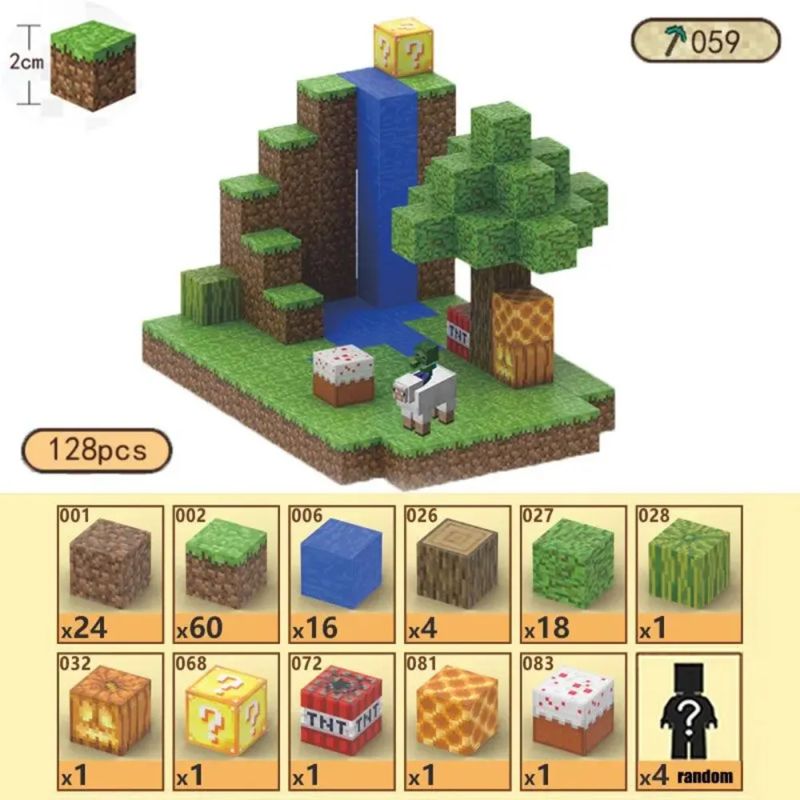 Магнитен конструктор с 128 блока в стил Minecraft. Позволява лесно сглобяване на пикселизиран свят с водопад, дърво и герои.