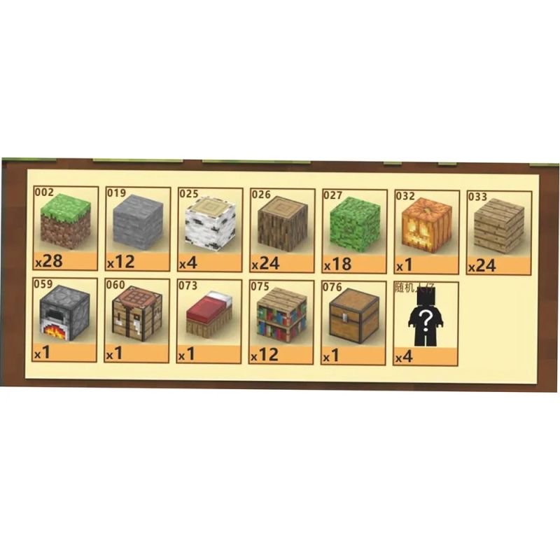 Комплектът включва разнообразни елементи като тревни блокове, дърво, каменни блокове, библиотека, легло и други детайли, които позволяват изграждане на интересна сцена с къща и околна среда.