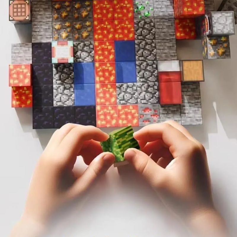 Магнитен конструктор с 128 блокчета в стил Minecraft. Позволява изграждане на мини сцена със стая, библиотека и дърво.