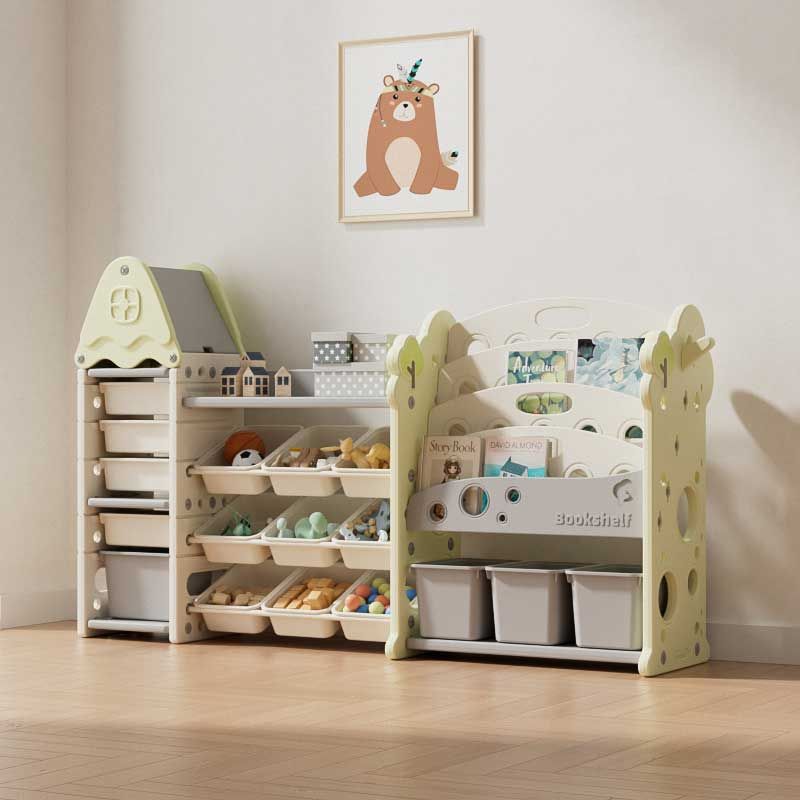 Детска етажерка-органайзер за играчки и книги със 17 отделения и изтеглящи се кутии, зелена