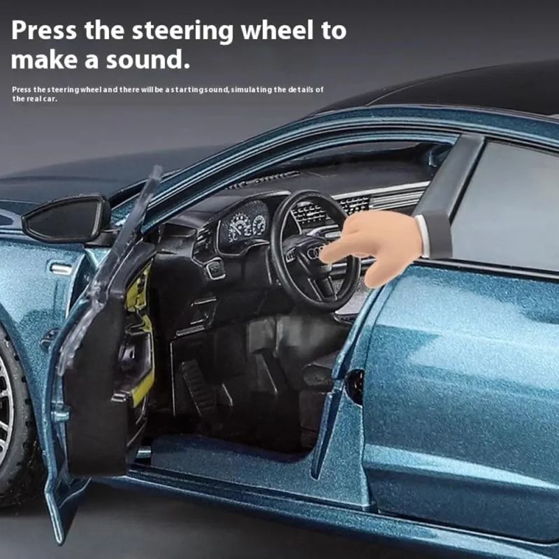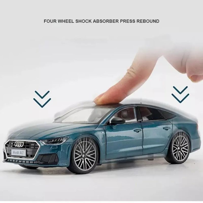 Висококачествен метален модел Audi A7 в мащаб 1:24 с отварящи се врати, капак и багажник – детайлен, стилен и подходящ за колекционери.