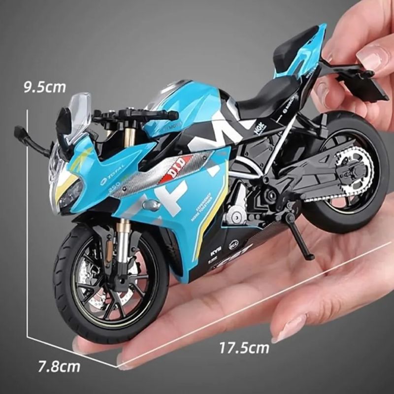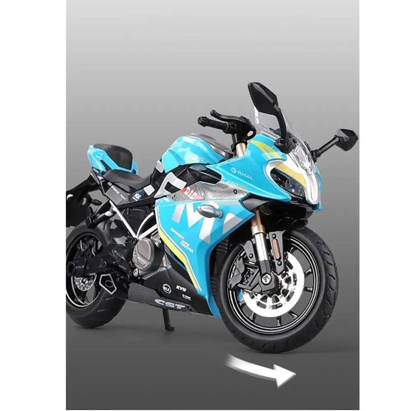 Атрактивен метален мотор в мащаб 1:12 със състезателен дизайн, реалистични детайли и въртящи се колела – идеален за колекция и подарък.