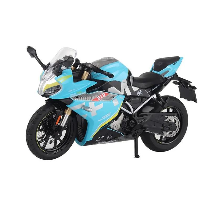 Синият състезателен дизайн с контрастни графики придава динамична визия, вдъхновена от професионалните пистови мотори. Всеки детайл е внимателно пресъздаден – от аеродинамичните обшивки и спортното предно стъкло до двигателя, окачването и спирачните дискове.