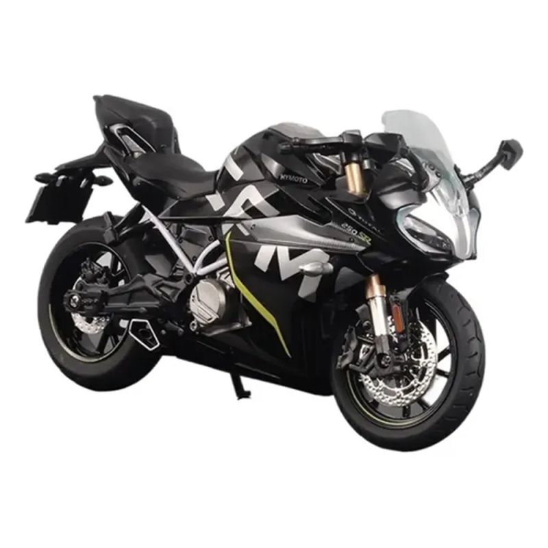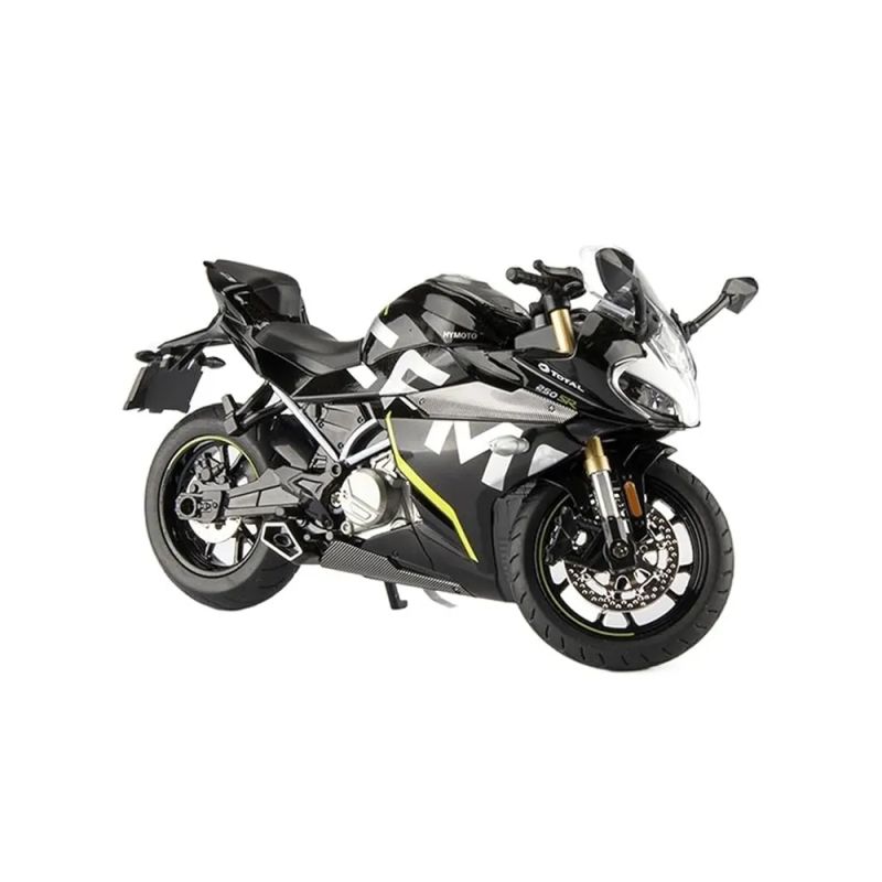 Премиум метален модел спортен мотор в мащаб 1:12 с агресивен черен дизайн, реалистични детайли и въртящи се колела.