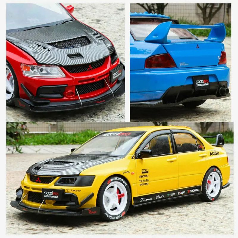 Спортен модел Mitsubishi Evo 9 в син цвят, мащаб 1:24, с карбонов ефект, отварящи се части и реалистичен JDM дизайн.