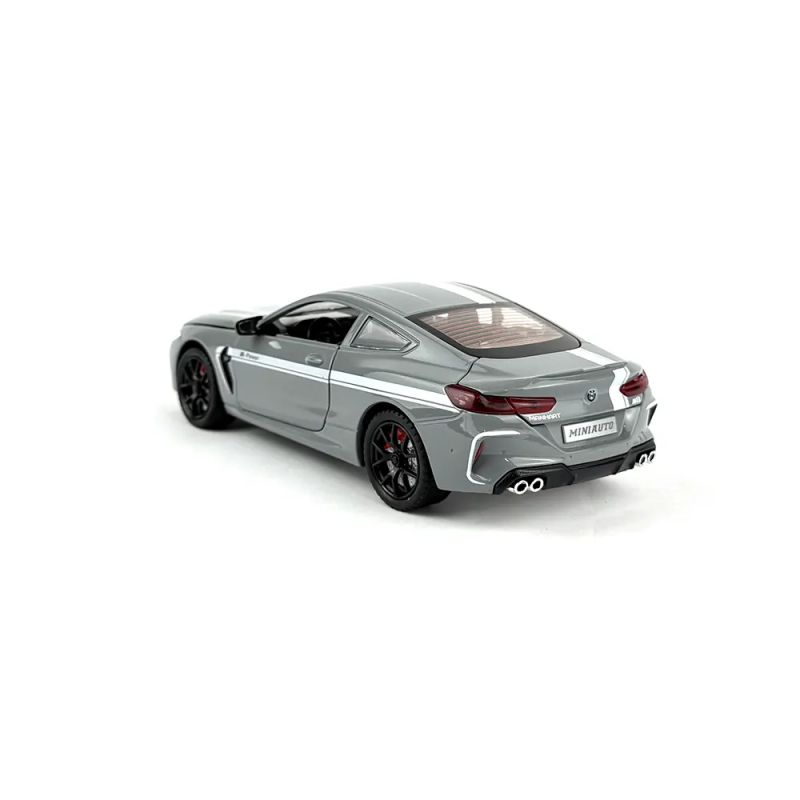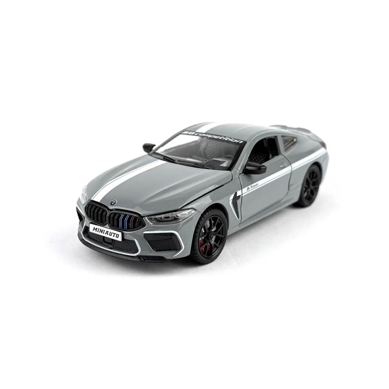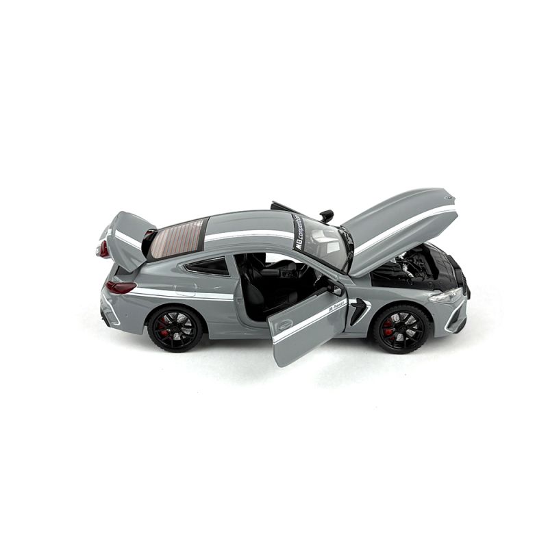 Премиум метален модел BMW M8 Competition 1:24 в сив металик, с отварящи се части и спортен дизайн – идеален за колекция и подарък.