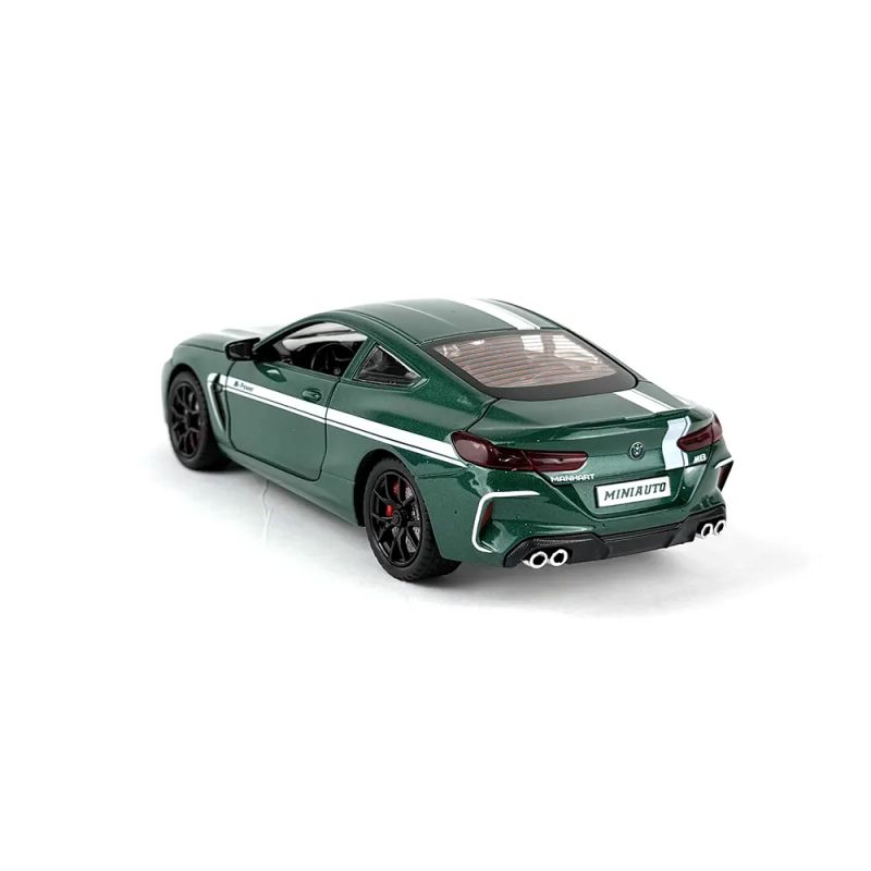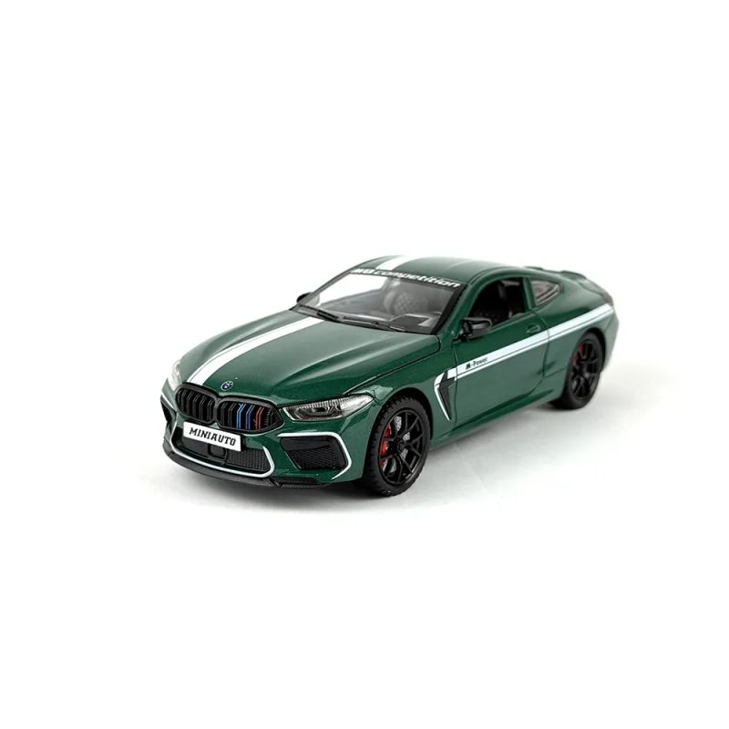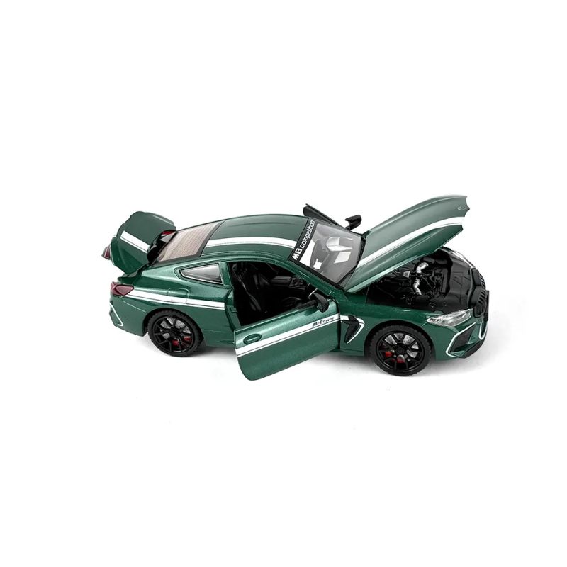 Стилен метален модел BMW M8 Competition 1:24 в зелен металик със спортни линии, отварящи се части и реалистична визия.
